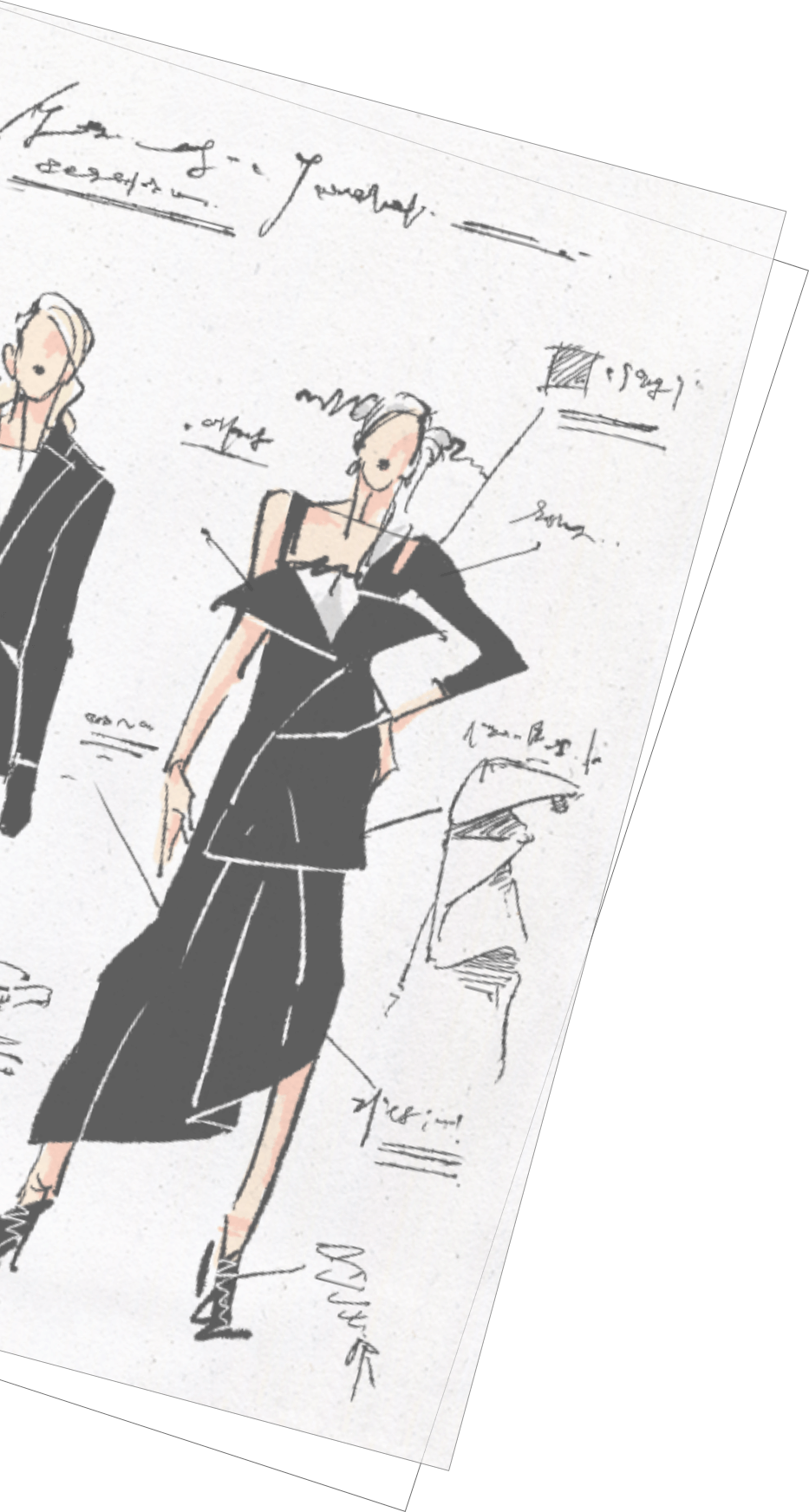 その奇抜すぎるデザインは、型紙を見ただけではどのような順で縫製すれば良いのか、理解するのが難しい程複雑な案件でした。パーツを縫製するにも難易度の高いデザインに加え、素材の異なる高級薄物生地を組み合わせながら仕上げなければなりませんでした。私たちは、いかに無駄な生地を出すことなく、型紙通りの寸法で断裁し、正確に縫い合わせる事ができるか手腕が問われました。